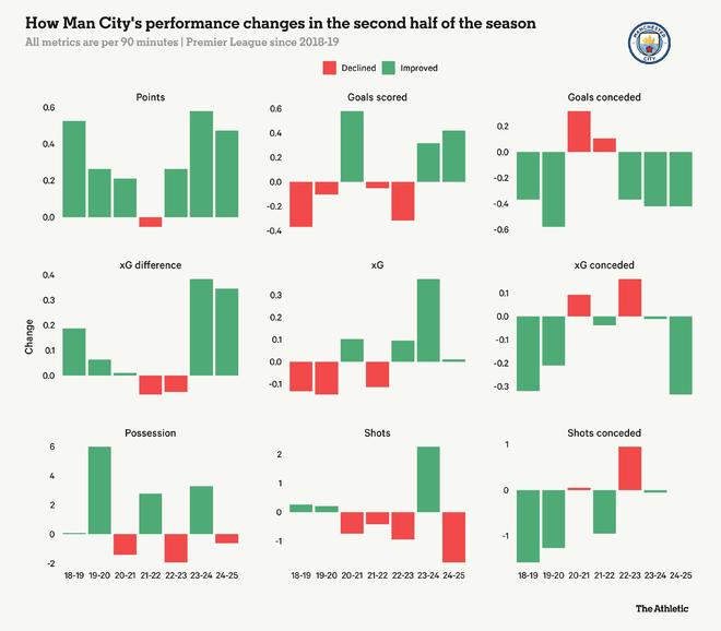 下图中的数字显示,他们的积分往往在赛季中期后飙升,并且其基础是防守端逐渐稳固。瓜迪奥拉会利用上半赛季的经验教训来填补漏洞,为另一座冠军铺平道路